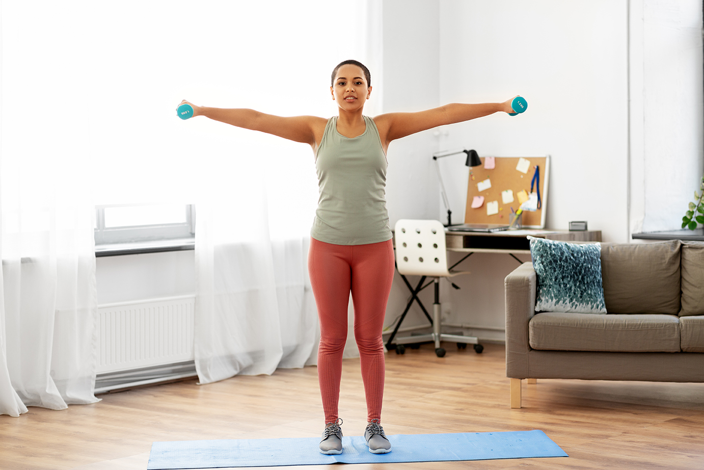 Círculos con los brazos. Póngase de pie, con los pies separados al ancho de las caderas y los brazos extendidos hacia los lados. Manteniendo los hombros abajo y el core firme, eleve los brazos y gírelos en círculos durante 30 segundos. Luego, invierta la dirección. Use mancuernas para mayor intensidad.